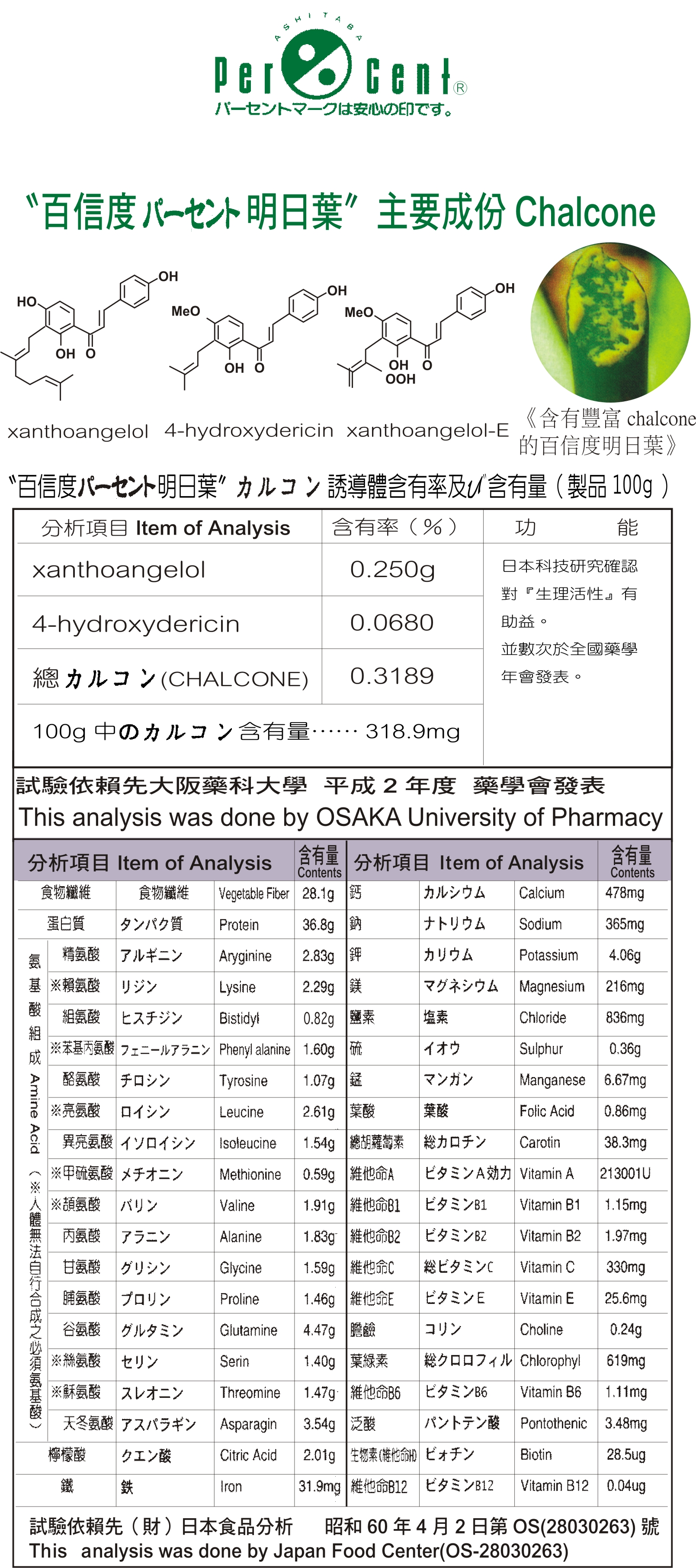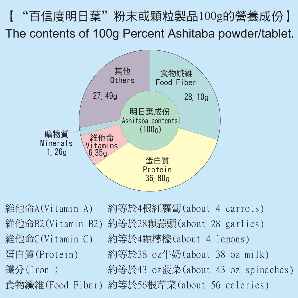 明日葉所含的特殊營養成份是人體所需要或不可缺少的,且不易經由其他食物獲得。依據明日葉的成份分析結果發現, 其所含的營養成份及Chalcone的含量以“嫩芽”部份最為豐富。採收明日葉時,只採摘嫩芽部份作為“百信度明日葉”粉末及顆粒的原料。這也是提供給日本大阪藥科大學研究的原材料。